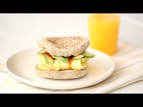 English Muffin Avocado }}- Sarah Carey makes a NYC deli style breakfast sandwich by pairing eggs with avocado and folding it perfectly onto a toasted English Muffin, scallions and hot ...